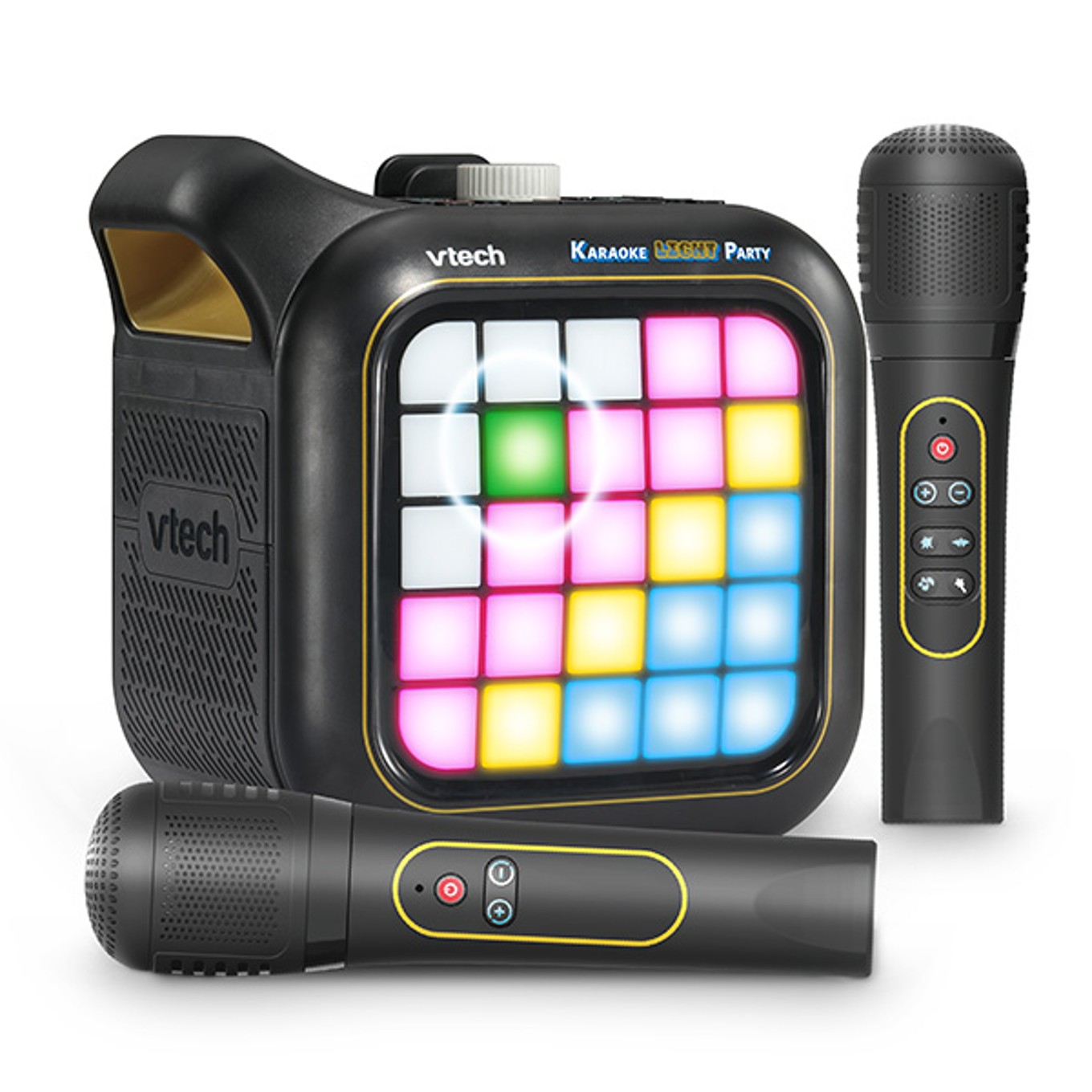 Connect and listen to your music with the Karaoke Light Party by VTech. This cool, portable, multifunctional Bluetooth® speaker features two wireless microphones. Use the microphones to sing your favourite songs, or sing along to the built-in songs and add fun voice effects to your voice! There are 8 exciting built-in games for 1 or 2 players available for practising and enhancing your singing skills, and other games such as a version of the retro game, Snakes! On the front of the speaker there are 25 pixel buttons. Turn the colour dial and press each pixel button to create up to 10 unique pixel arts and watch how they dance along to the music! In music mode set the lights to play and create a relaxing light display, or fun lights fit for a party! Make every Karaoke party, a Karaoke Light Party!